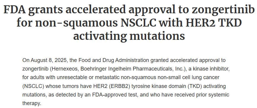 美国食品药品监督管理局 (FDA) 已加速批准 Hernexeos ( zongertinib),用于治疗患有不可切除或转移性非鳞状非小细胞肺...